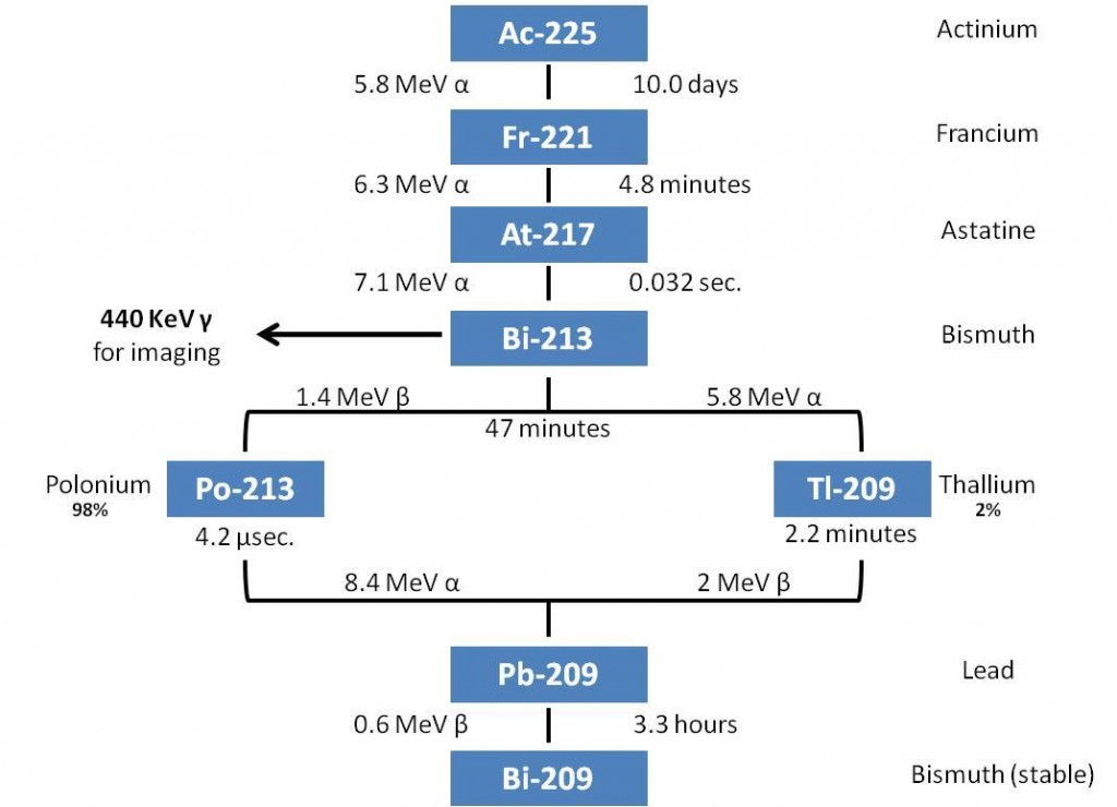 Het algemene nadeel van de gangbare Alpha isotopen is dat zij een relatief lange halveringstijd (de tijd die bepaalt hoe lang het duurt dat de radio actieve lading naar nul afneemt ) hebben. Daardoor worden Alpha’s wel gebruikt voor medische toepassingen, maar altijd in extreme gevallen waar men de langdurige nawerkende radio-actieve reststraling en de schade die dit weer oproept voor lief neemt. Er is evenwel één Alpha isotoop die ideaal is voor medische toepassingen en dat is Bismuth-213. Deze isotoop heeft immers een halveringstijd van slechts een dik half uur. Het verval product van Bismuth-213 (nadat de energieafgifte heeft plaats gevonden) is lood. Lood is weliswaar giftig, maar de belasting van het lichaam blijft ruim binnen de marges die door voedsel en waren authoriteiten als aanvaardbaar worden beschouwd.